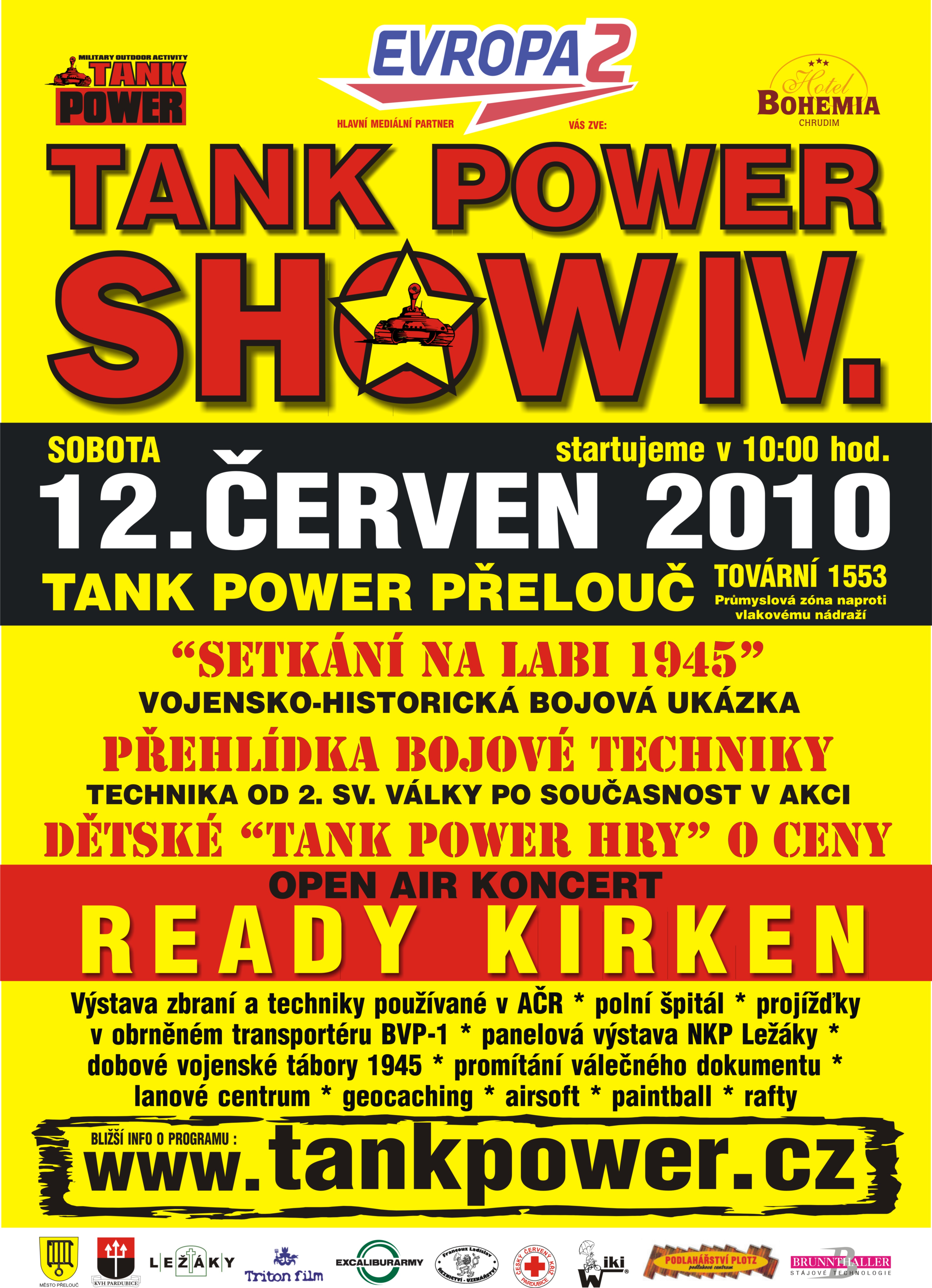 Udělejte si výlet a přijeďte v sobotu 12.6.2010 do Přelouče u Pardubic na čtrtý ročník Tank Power Show. Uvidíte vojensko-historickou bojovou ukázku s více než 60ti vojáky Rudé armády, U.S. Army a Wermachtu a autentické techniky z 2.světové války. Budete mít možnost si prohlédnout dobové tábory 1945, zbraně a techniku používanou v AČR, polní špitál nebo panelovou výstavu NKP Ležáků. Pro nejmenší návštěvníky jsou připraveny dětské Tank Power Hry o ceny. Po celý den můžete vyzkoušet atrakce areálu jako je lanové centrum, projížďky v bojové technice, geocaching, airsoft, paintball, rafty… A zažít atmosféru koncertu Ready Kirken pod širým nebem.