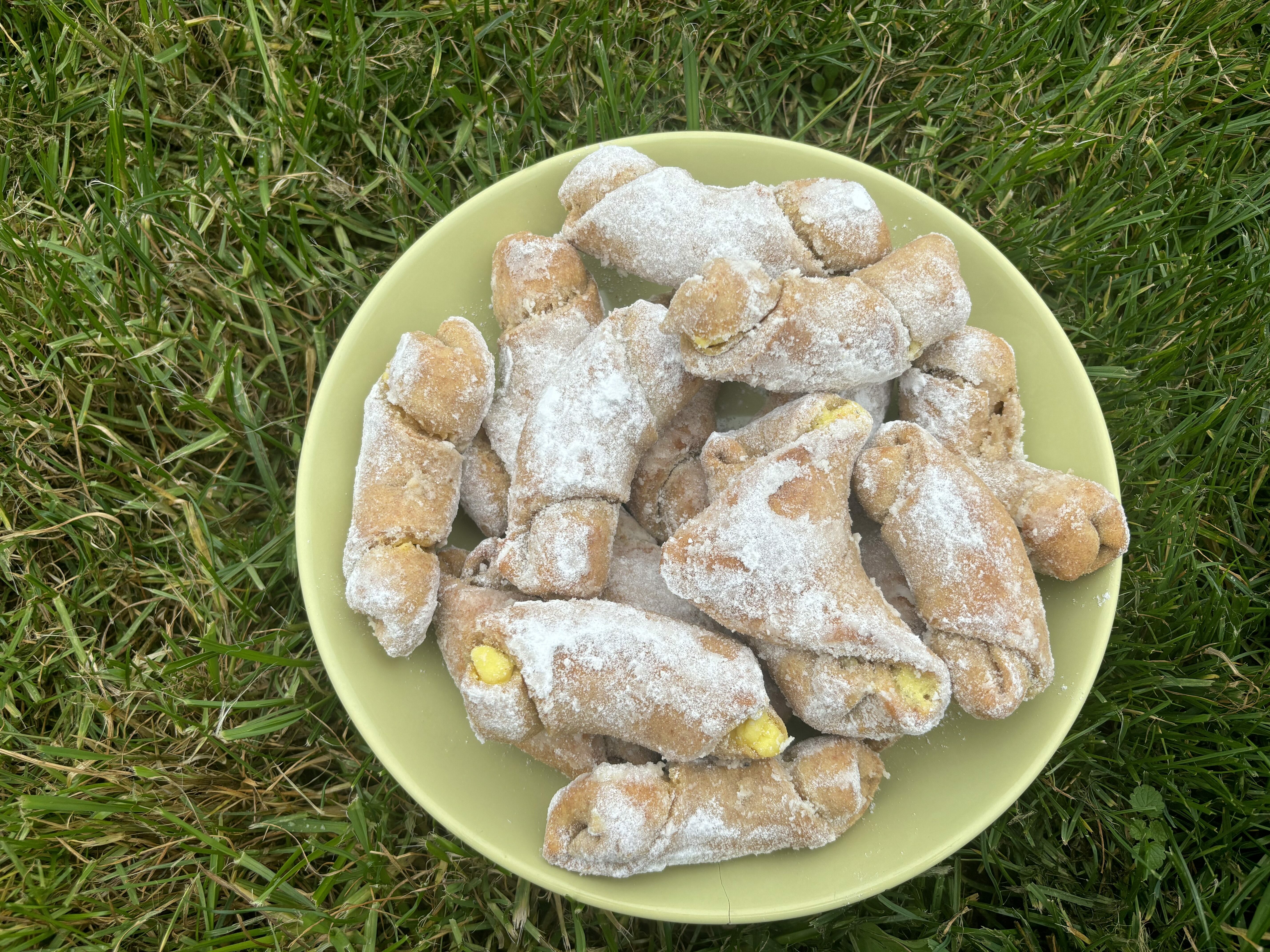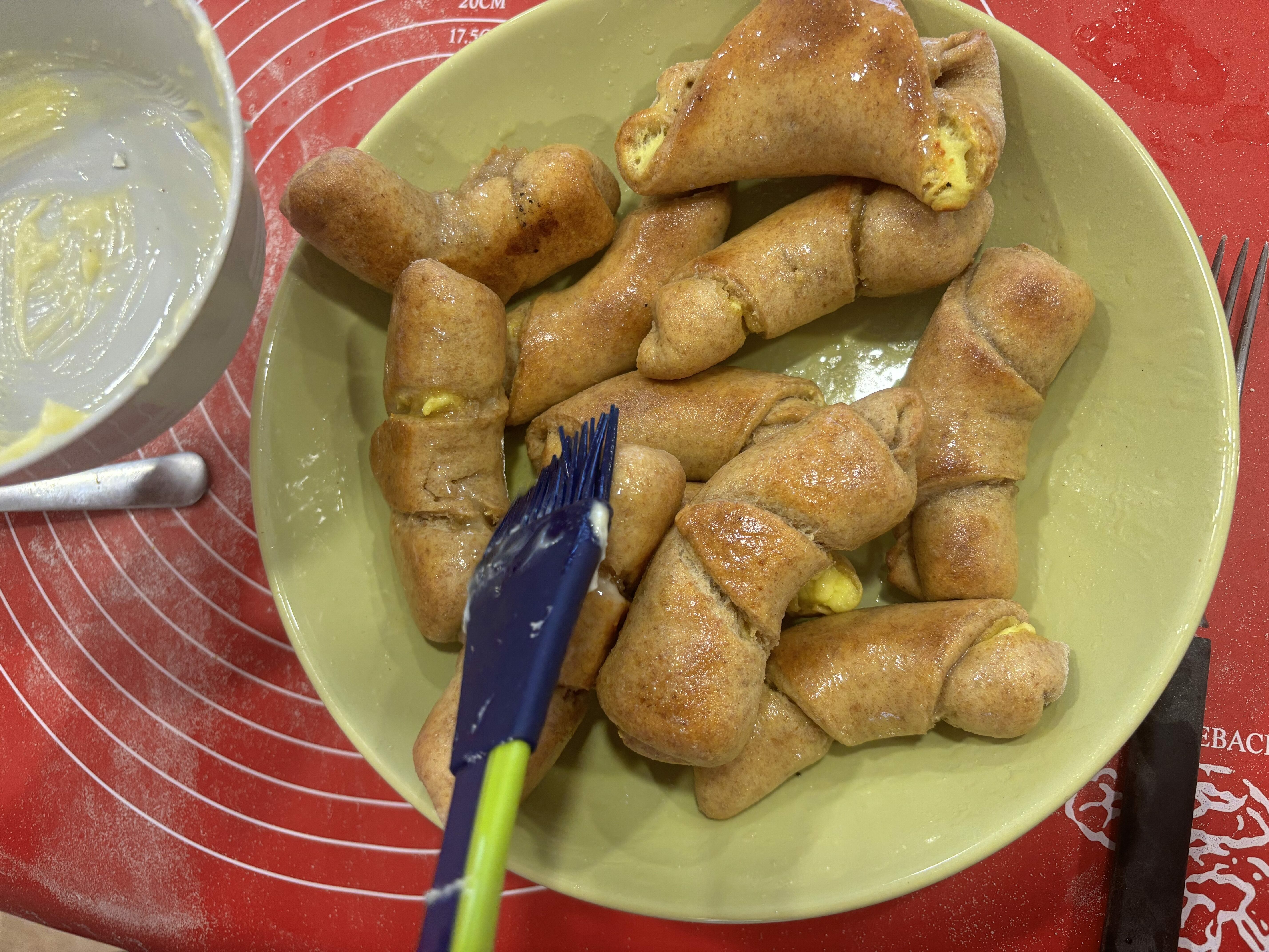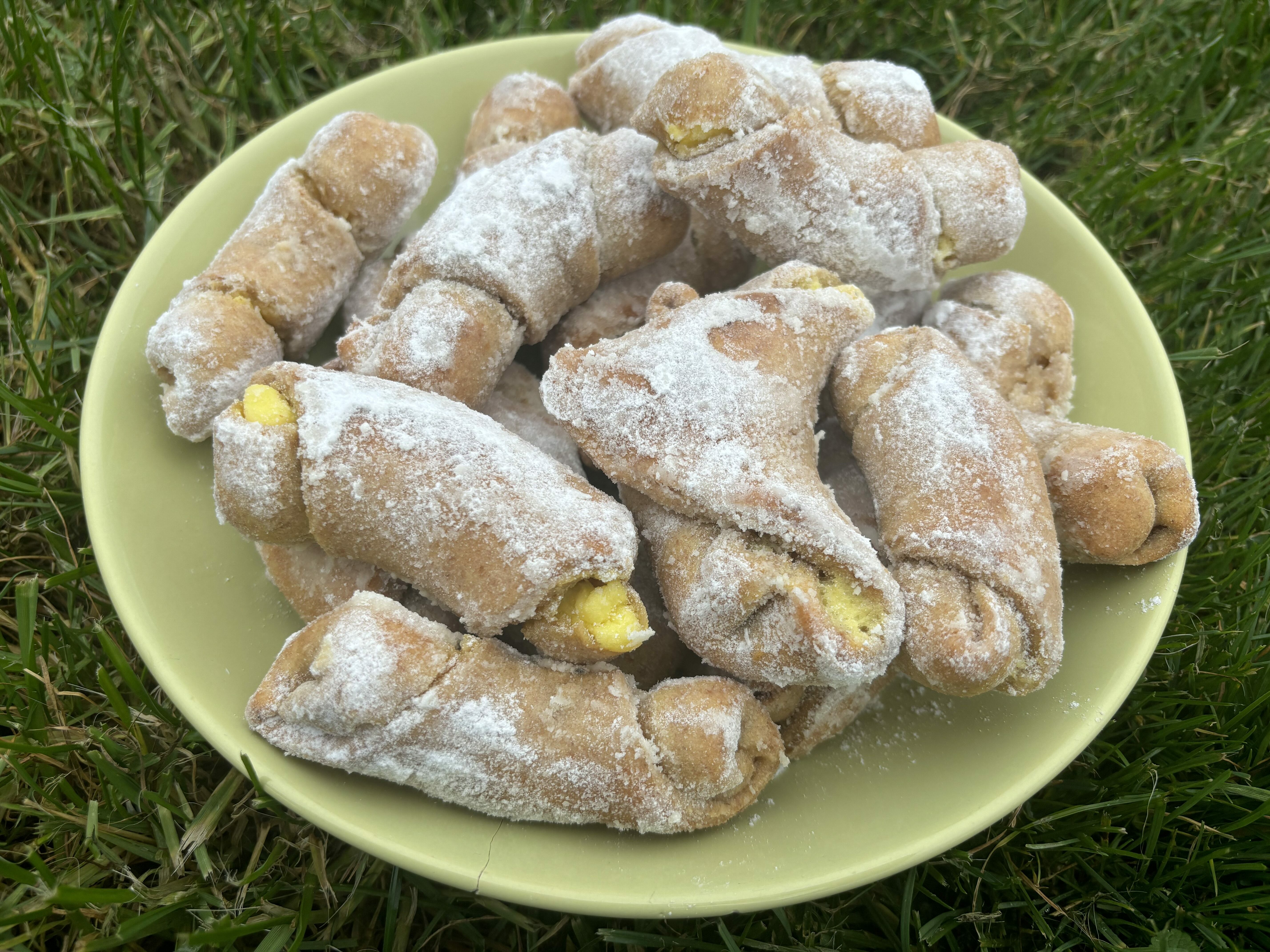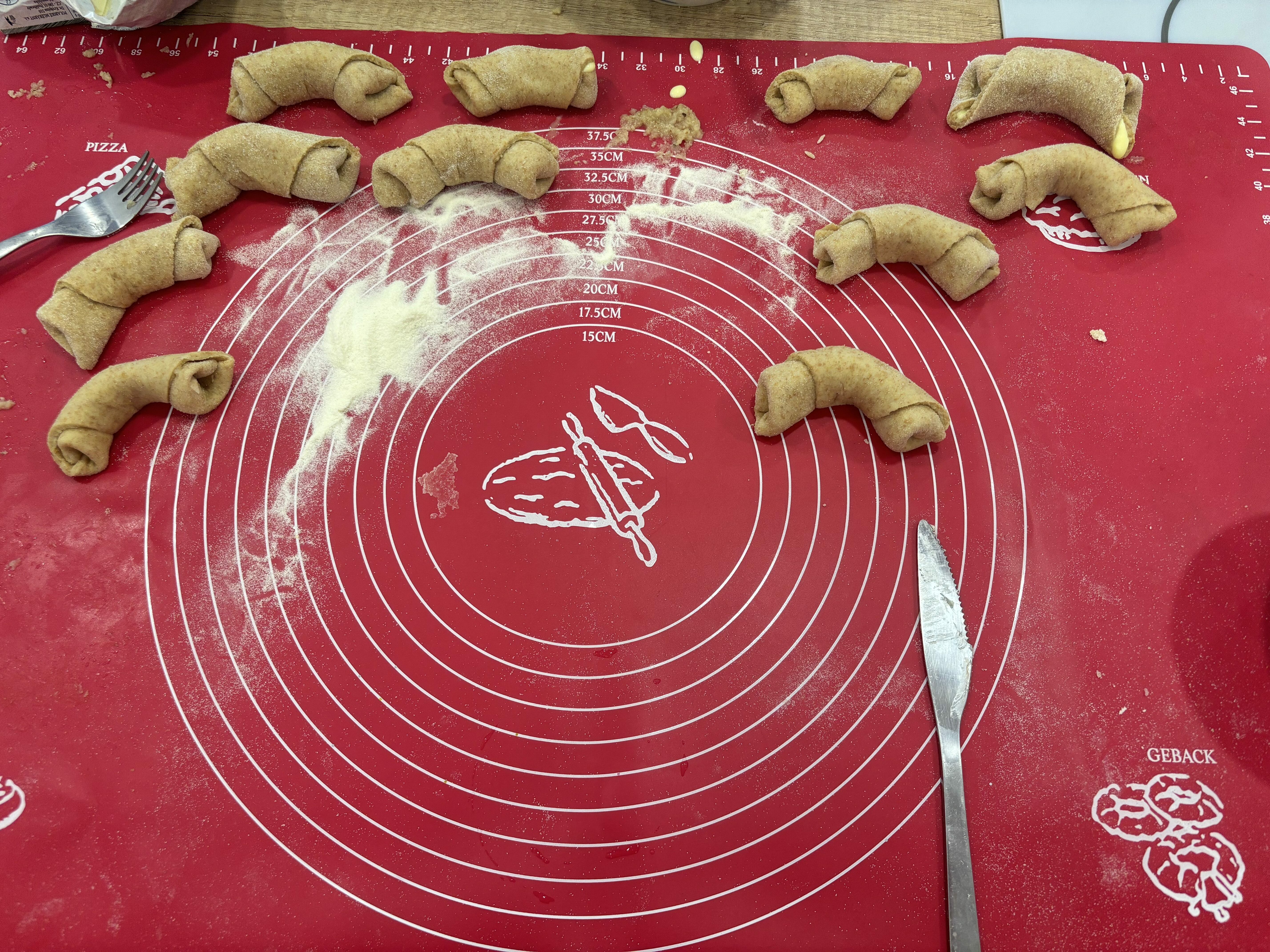 Náplně můžete použít jaké chcete a jaké máte rádi. My jsme rohlíčky dělali s jablečno-oříškovou náplní a s tvarohem.