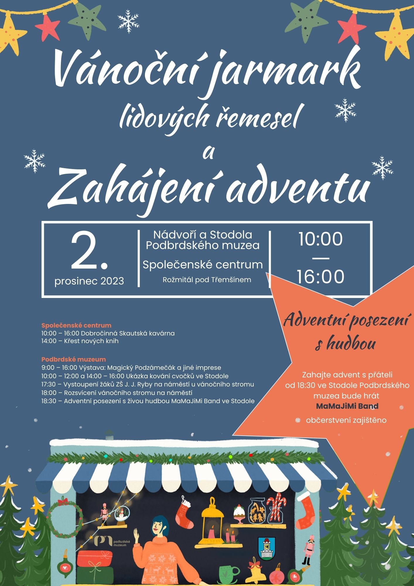 v 18 hodin společně rozsvítíme vánoční strom. Od 18:30 vás zveme na Adventní posezení s hudbou MaMaJiMi Band ve Stodole Podbrdského muzea. Občerstvení zajištěno.