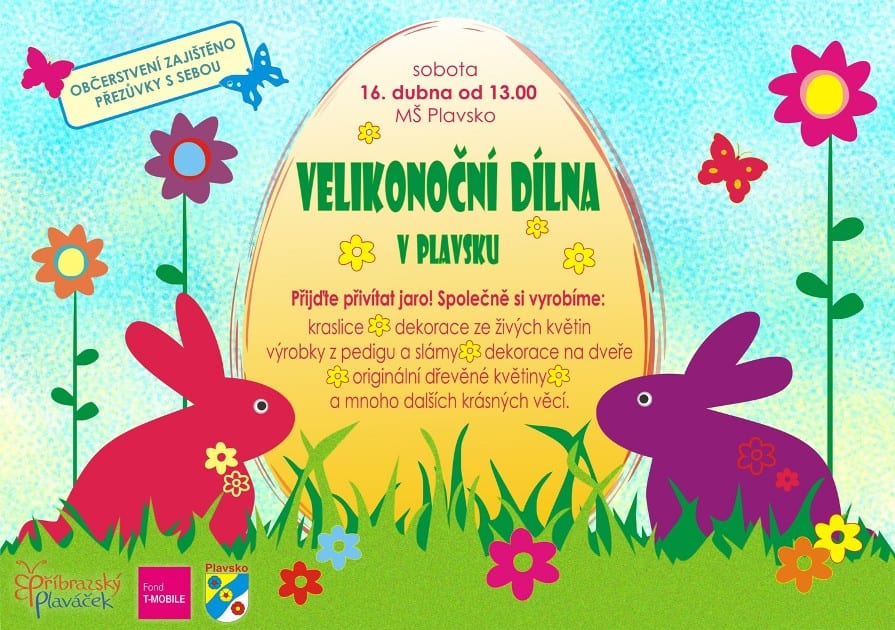 Tak jsme se konečně dočkali. Je tu jaro a blíží se i letos pořádně posunuté Velikonoce. V sobotu 16. dubna od 13,30 hod. pořádáme již tradiční Velikonoční dílnu v Plavsku. V prostorách MŠ si s námi můžete vyrobit drobnosti z pedigu, krásné dřevěné dekorace, dekorace na vstupní dveře z proutí a slámy. Nebude chybět ani paní Lapková se svými originálními dekoracemi ze živých květin.