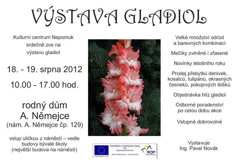 Kulturní a informační centrum Nepomuk zve na VÝSTAVU GLADIOL 18. – 19. srpna 2012, 10.00 – 17.00 hod. Nepomuk, rodný dům A. Němejce.