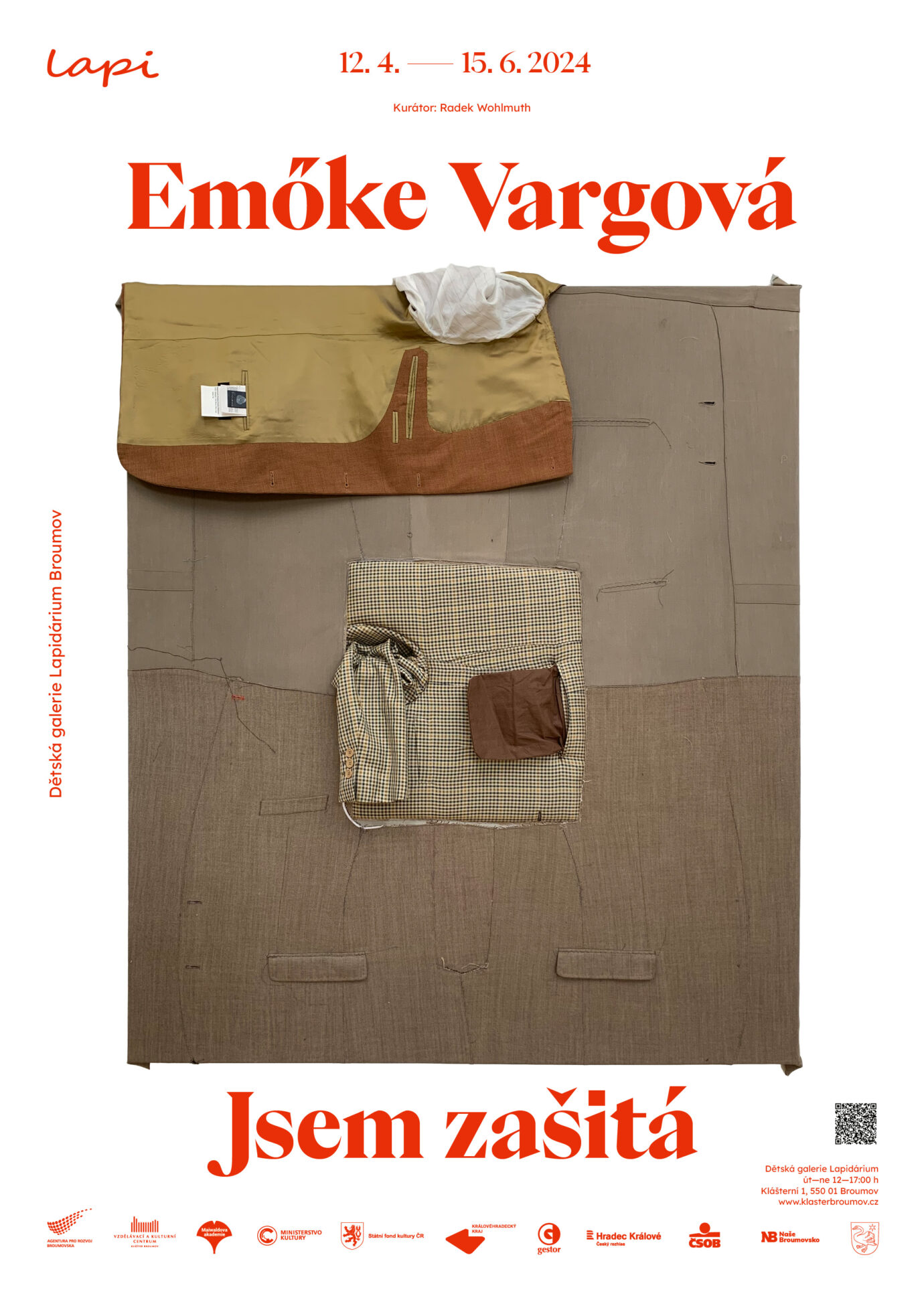 Ve čtvrtek 11. dubna v 16 hodin bude v Dětské galerii Lapidárium v broumovském klášteře zahájena výstava „Jsem zašitá“ slovenské autorky Emőke Vargové. Kurátorem výstavy, která potrvá do 15. června, je historik umění a výtvarný kritik Radek Wohlmuth. Pro veřejnost i pro školní kolektivy budou připraveny doprovodné programy.