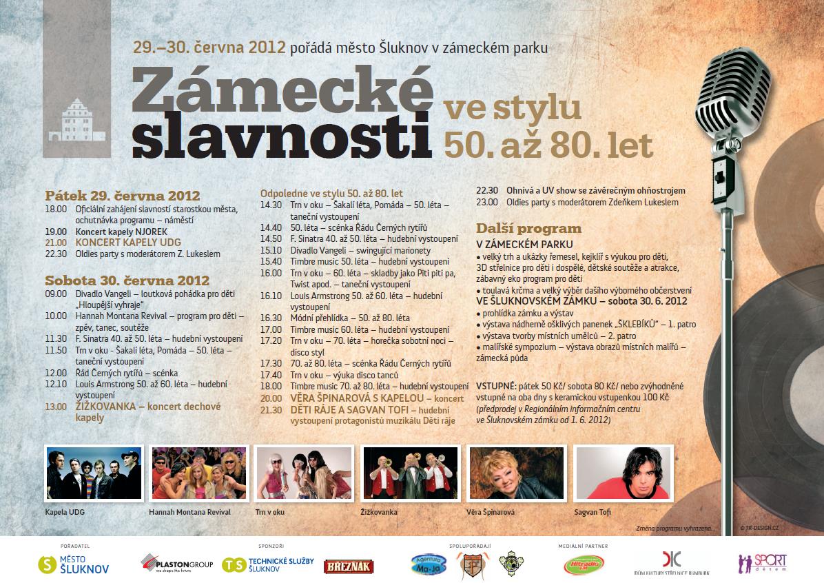 Město Šluknov pořádá v zámeckém parku již tradiční Zámecké slavnosti, tentokrát v pořadí již šesté od znovuotevření Šluknovského zámku po jeho rekonstrukci, které se budou konat 29. a 30. června 2012.