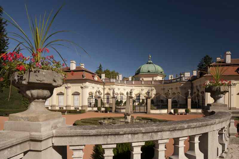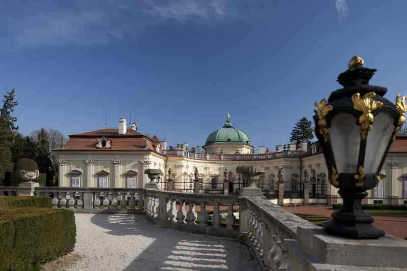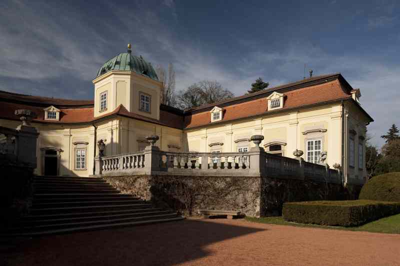 Barokní zámek postavený na způsob italské vily na přelomu 17. a 18. století představuje ojediněle řešený architektonický komplex dvou samostatně stojících půlkruhových budov s čestnými dvory, hlavního dolního zámku a horního hospodářského stavení zvaného Flóra. Tato honosná stavba byla vybudována patrně podle plánů architekta Domenica Martinelliho. Po jeho odchodu do Říma roku 1705 byla stavba zřejmě dokončena moravským architektem Mořicem Grimmem.