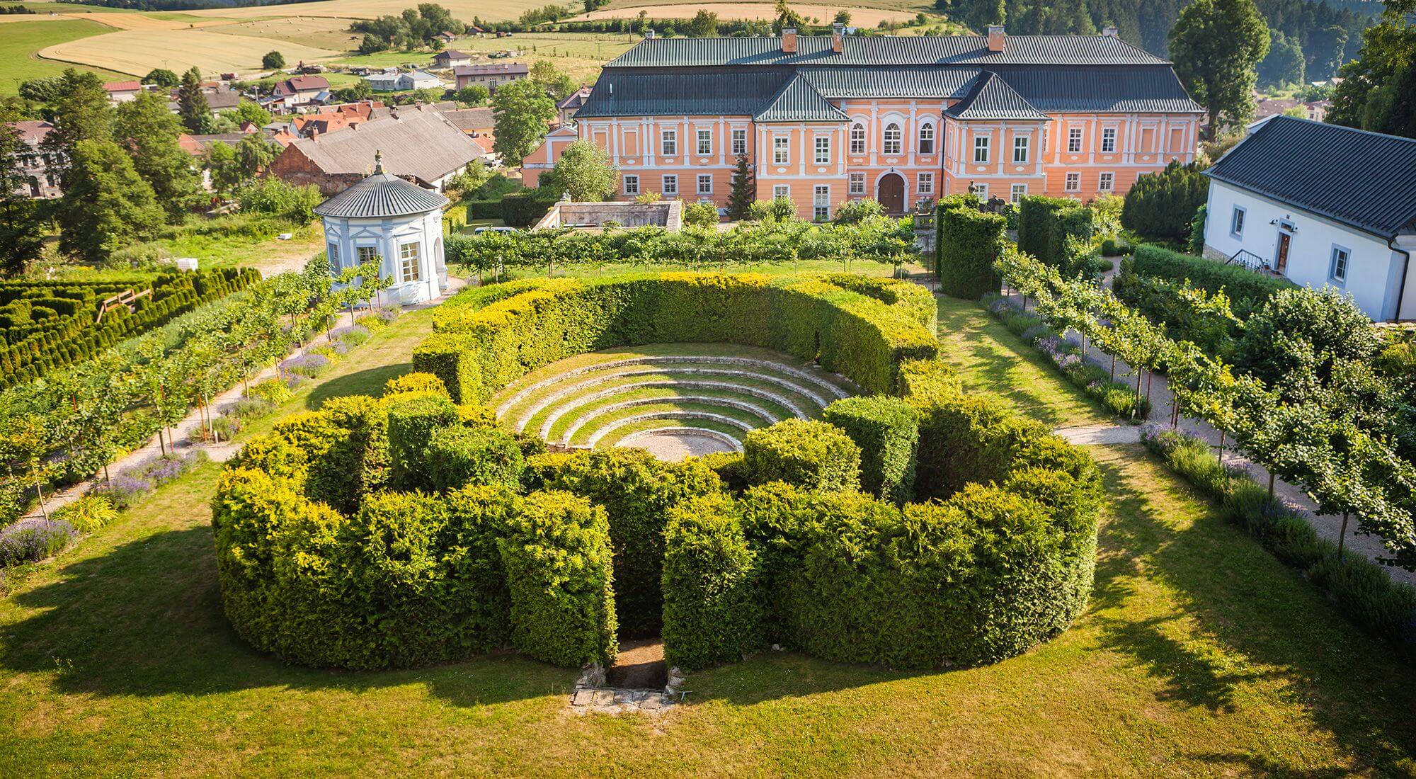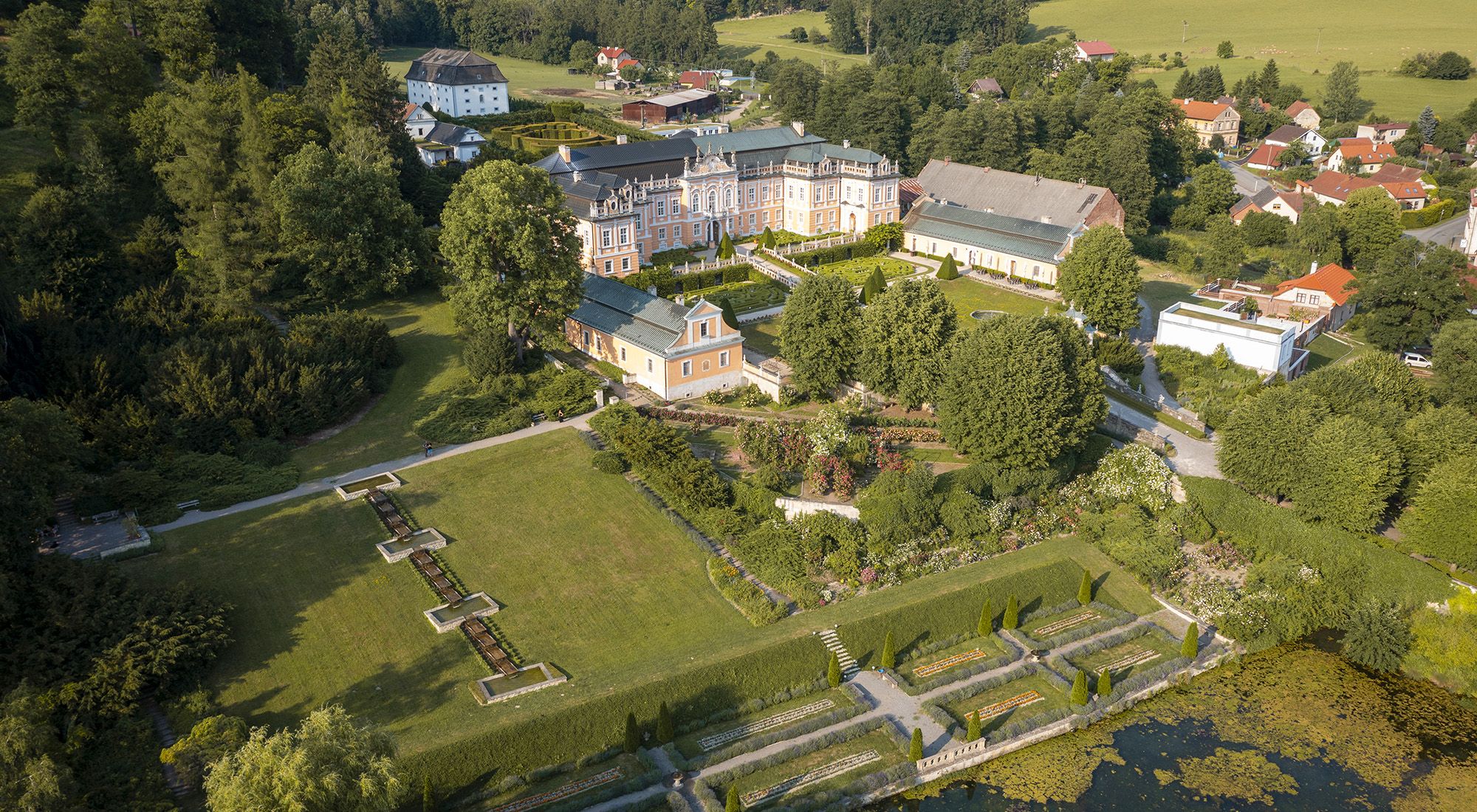 Rokokový zámek postavil v 18. století šlechtic Jean-Antoine Harbuval de Chamaré. Inspirován architekturou francouzských letních sídel je zámek nejčistší ukázkou rokoka v České republice. Dnes soukromý zámecký areál tvoří 20 hektarový ucelený komplex s romantickými zahradami, rozlehlým parkem a historickými hospodářskými budovami. Návštěvníkům nabízí odpočinek v zeleni proměňující se v ročních obdobích a historický vhled do estetiky na přelomu rokoka a klasicismu. Návštěvníkům je k dispozici kavárna s galerií a restaurace. Zámek můžete navštívit denně od května do konce září a v dubnu a říjnu je otevřeno o víkendech a svátcích. Vstup do zámeckého areálu je zpoplatněn.