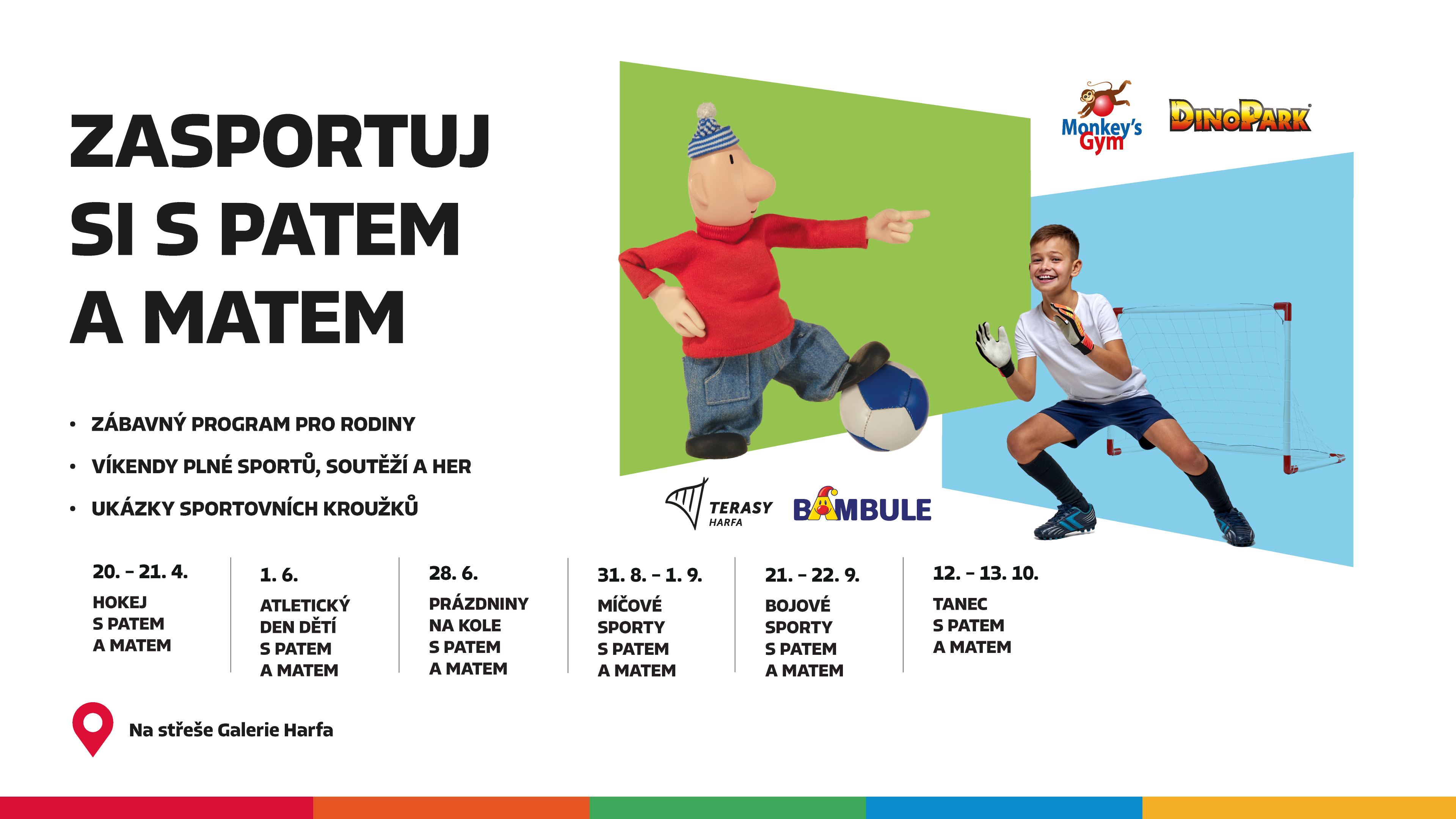 Budeme se na vás těšit v pátek nebo o víkendech od 11:00 do 18:00 na Terasách Harfa. Děti si zasportují, pobaví se, něco se naučí a vy si budete moci odpočinout a ochutnat dobroty v našich stáncích.