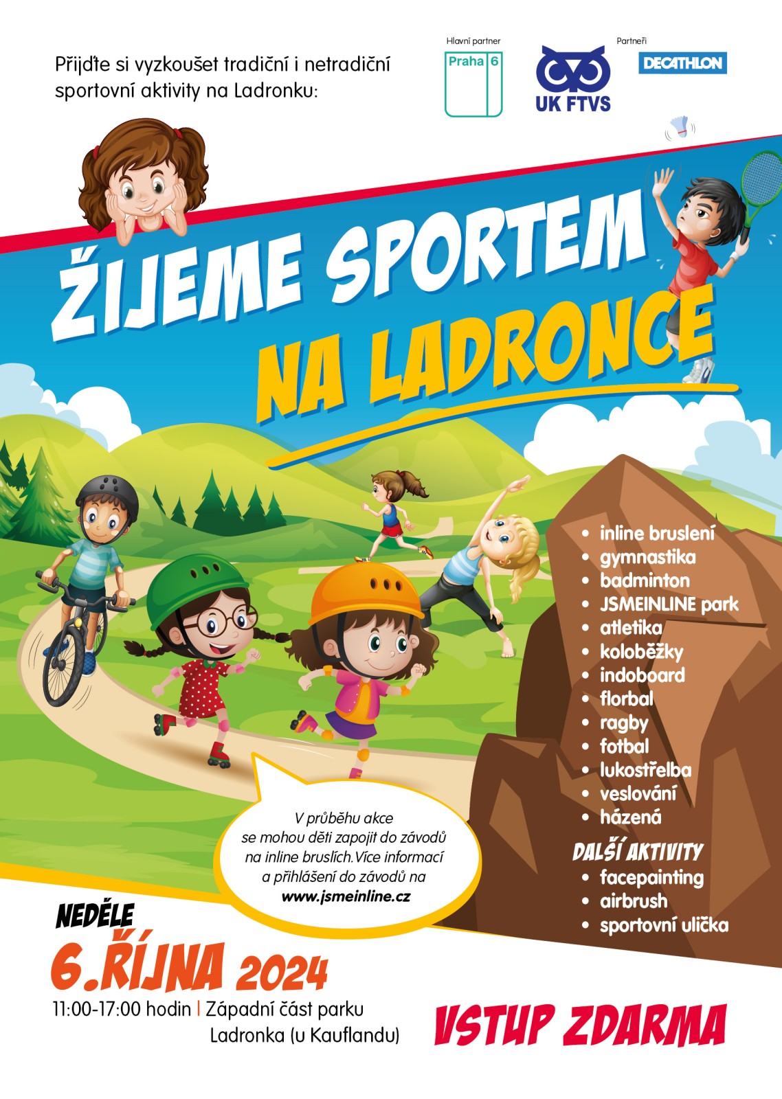 Přijďte si užít s dětmi den plný sportu na Ladronce. Čeká vás více než 14 sportů, které si vaše děti mohou vyzkoušet, včetně inline bruslení, lukostřelby nebo gymnastiky. Kromě sportovních aktivit bude připraven i doprovodný program a odměny pro každého malého sportovce.
