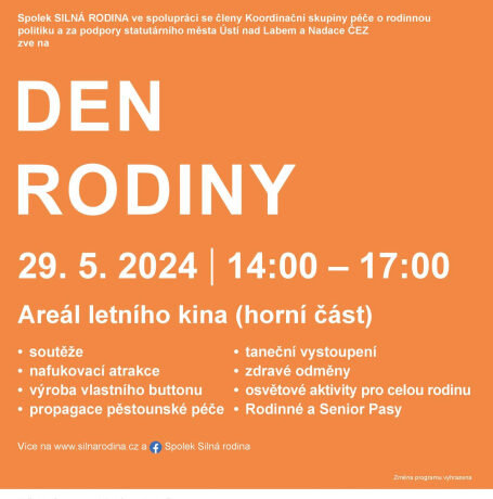 Zveme vás již na 5. ročník tradiční akce DEN RODINY, tentokrát v prostorách Letního kina v Ústí nad Labem. Jako každý rok se můžete těšit na sportovní a tvořivá...