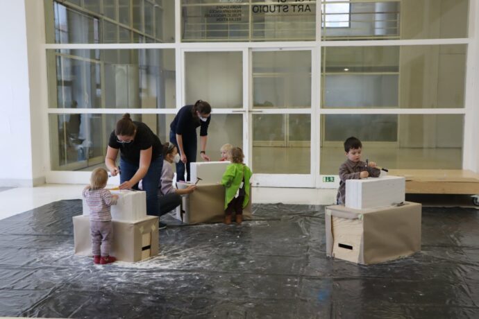 Workshop pro děti 6+ v doprovodu rodičů, prarodičů nebo jiného dospělého v Korzu Veletržního paláce k sbírkové expozici 1939–2021: Konec černobílé doby, zaměřený na tvorbu sochaře...