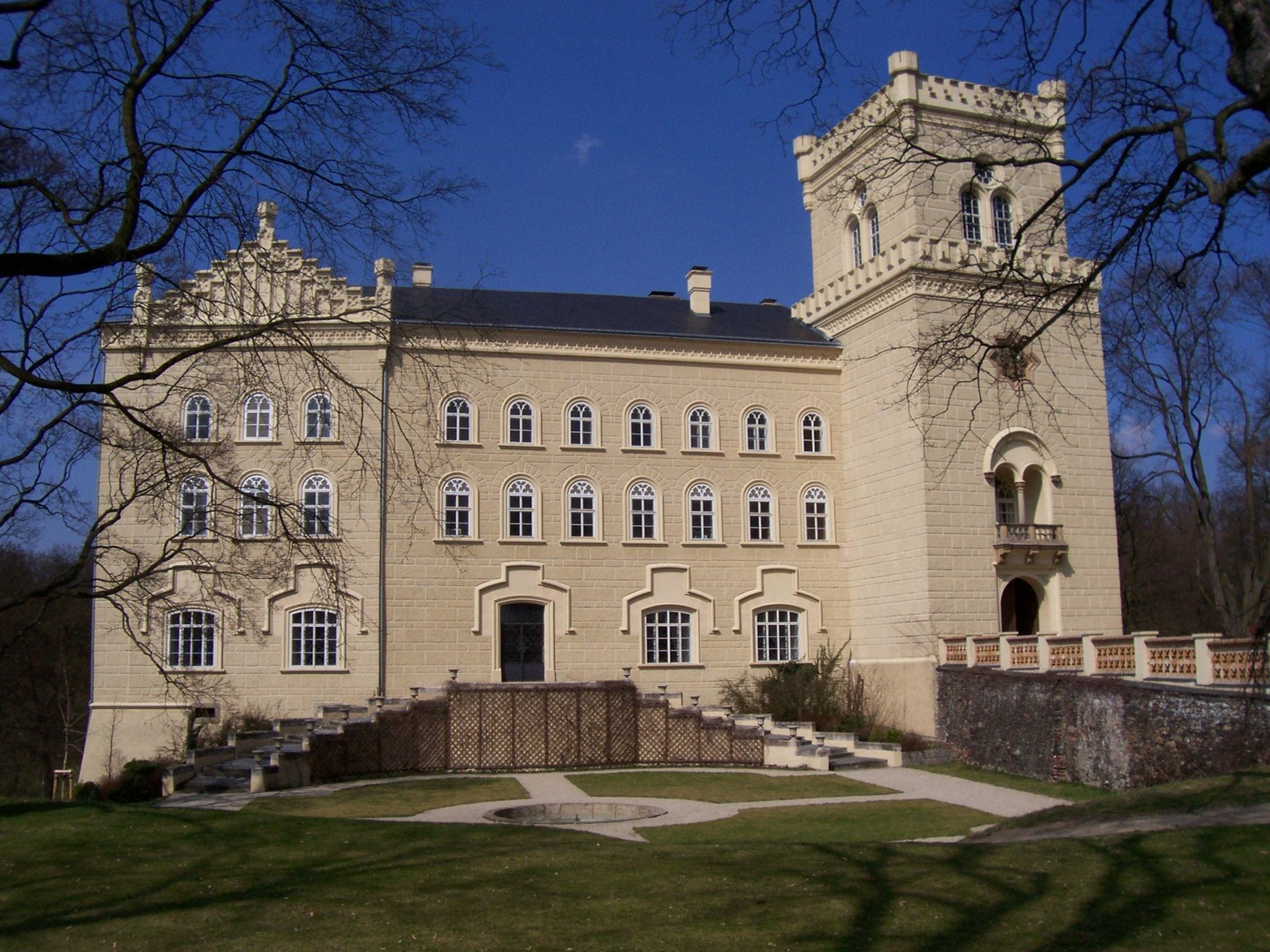 Původní hrad byl založen ve 13. století. Po husitských válkách byl zbořen a obnoven asi až za Buriana z Gutštejna po roce 1473. Za Mikuláše z Lobkovic byl renesančně přestavěn. V 18. století byl upraven barokně. Od roku 1766 jej vlastnili Lazanští a za nich vznikla dnešní novogotická podoba zámku z let 1856–1858 pod vedením V. I. Ulmanna. Po roce 1989 tímto rodem opět restituován, opraven a zpřístupněn veřejnosti. Jedná se o mohutný komplex budov okolo nádvoří s dvěma věžemi v upraveném parku. Zajímavostí je, že v roce 1917 tu působil jako vychovatel Karel Čapek.